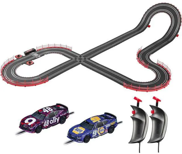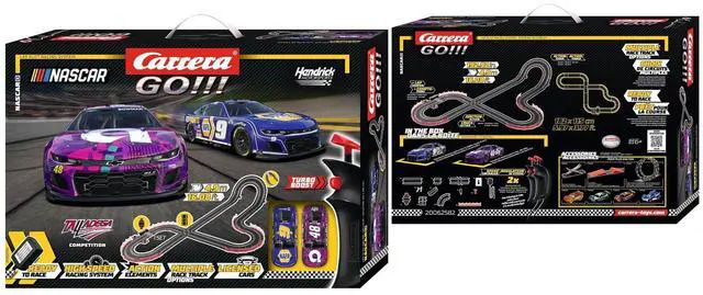 Race head-to-head with this high-speed, Carrera GO!!! 1:43 scale analog slot car racing toy set featuring your favorite NASCAR cars! The Carrera GO!!! slot car racing system offers big fun in a smaller scale. Each set comes with everything you need to start racing and having fun. Hitting scaled speeds of up to 370-mph is no problem for the popular cars as they speed around this 16.08 -ft. long track. This set includes a lap counter to keep track of the leader and a junction track for even more challenge and excitement! Rated for ages 6 and up, kids and adults alike will get countless hours of fast racing fun! Carrera GO!!! slot car racing sets are compatible with all Carrera GO!!! cars and track accessories allowing you to customize and expand for even more racing fun. Cars included are Officially LicensedNASCAR Camaro NextGen ZL1 Hendrick Motorsports, Chase Elliott, No. 9and NASCAR Camaro NextGen ZL1 Hendrick Motorsports, Alex Bowman, No. 48