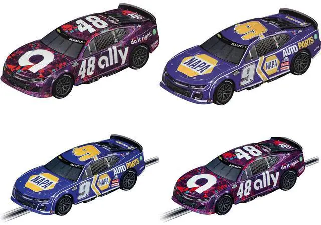 Hendrick Motorsports racing team: NASCAR Camaro NextGen ZL1 Hendrick Motorsports, Chase Elliott, No. 9, and the NASCAR Camaro NextGen ZL1 Hendrick Motorsports, Alex Bowman, No. 48. Carrera GO!!! Slot Car Racetrack