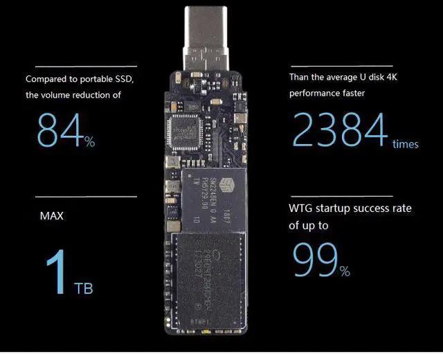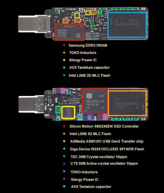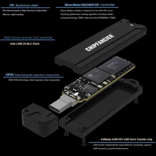 Use SSD master chip development, with close to the SSD's powerful performance, the interface for the USB 3.1 GEN2 TYPE-C, support 2016 MACBOOK Thunderbolt3 TYPE-C interface and mobile phone TYPE-C, support WINDOWS TO GO New MLC Positive Particles Silicon Motion solution, 4-channel 32 core BCH ECC error checking, Overall situation wear balance algorithm, DevSleep depth energy saving technology, GC, read and write IOPS 80000/75000 TXC, TDK, murata tolerance pieces ASMedia latest ASM1351 control transmission protocol IC USB 3.1 GEN2 Pure aluminum alloy shell. USB 3.1 Transfer Protocol, Compatible Thunderbolt3 MAX seq W380MB/S, R500MB/S up to 512gb, 2384 times faster than ordinary USB flash drive of 4k performance Intel original USB 3.1 score 500+ ASMedia control chip USB 3.1 score 600+ For Windows to go Windows 8.1 or above, Linux, Mac os
