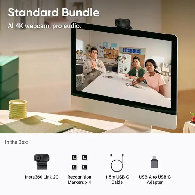 • Standard Bundle includes: 1 x Insta360 Link 2C, 1 x Magnetic Mount, 4 x Recognition Markers, 1 x USB-C Cable and 1 x USB-C to USB-A Adapter.