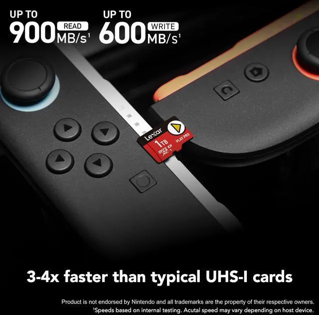 Power Up Your PlayThe Lexar PLAY PRO microSDXC Express Card gives gamers an epic performance power-up with up to 900MB/s read and 600MB/s write and capacity 1TB offers space for many AAA games. Revolutionary PerformanceThe PLAY PRO microSDXC Express Card is a stunning 4x faster than typical UHS-I microSD cards - meaning that games load faster and you get a smooth, lag-free experience. Cut Your Download TimesThe PLAY PRO microSDXC Express Card also delivers 600MB/s write speeds when paired with the Lexar microSD Express card reader so you can download a AAA game in less time than it'll take you to order a pizza! Massive CapacitySome of your favorite games are probably pretty big in file size.