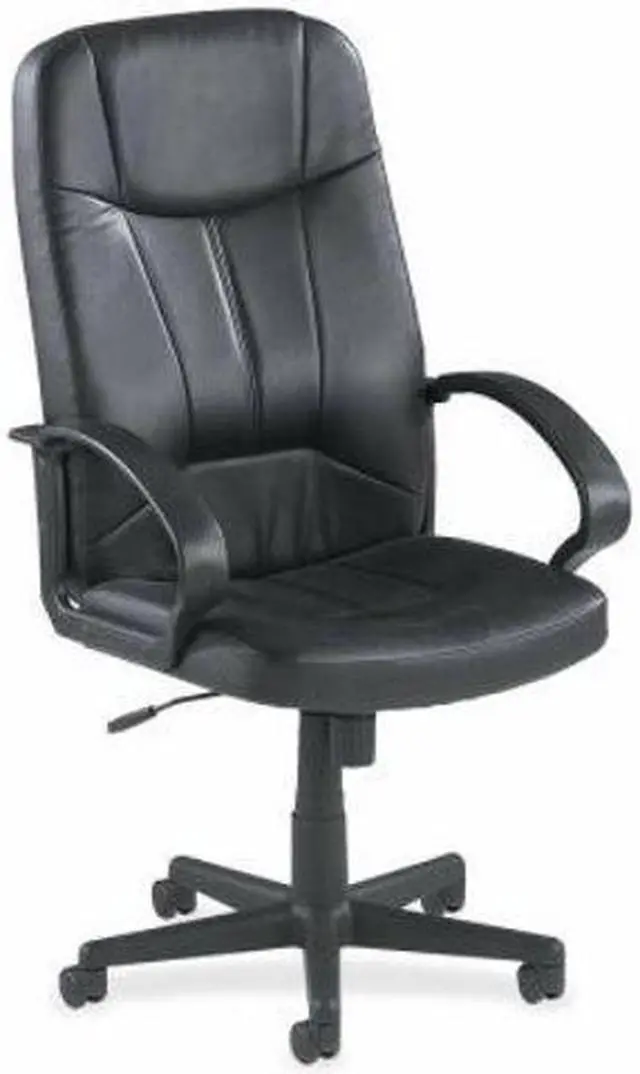 - Executive High-Back Chair offers a fully upholstered design with black, split leather for a rich classic look.