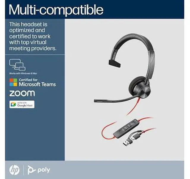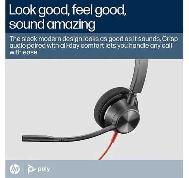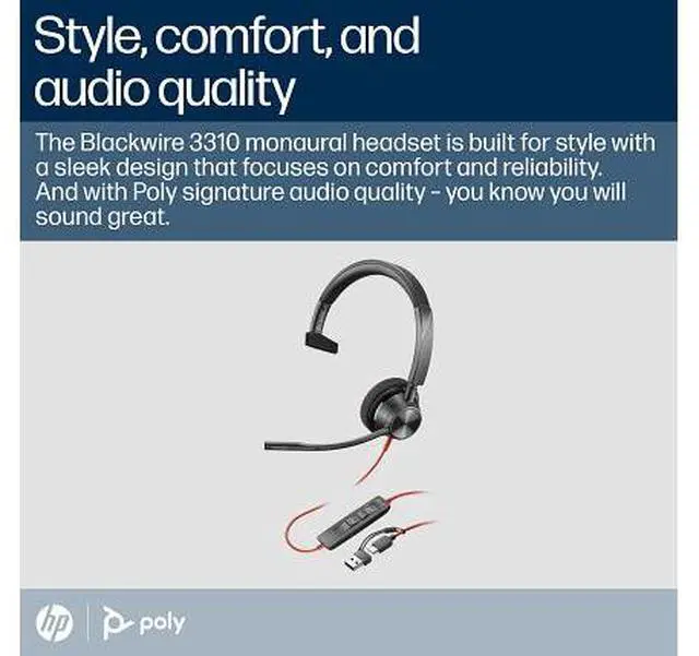 Style, comfort and audio qualityBuilt for style with a sleek design that focuses on comfort and reliability. Poly signature audio quality so you know you will sound great. And intuitive and simple features so every user can connect to their preferred device simply and easily. Connect quickly and easily The Blackwire 3300 Series is completely plug-n-play with USB devices, so users can take calls in the office or on the go. Its robust design delivers reliability you can count on. This is the hassle-free headset you've been looking for. Look good, feel good, sound amazing Boost your on-the-call confidence with professional-quality audio and a customized fit with a headset that can connect to your devices quickly and easily and is ready to go with you wherever you go.