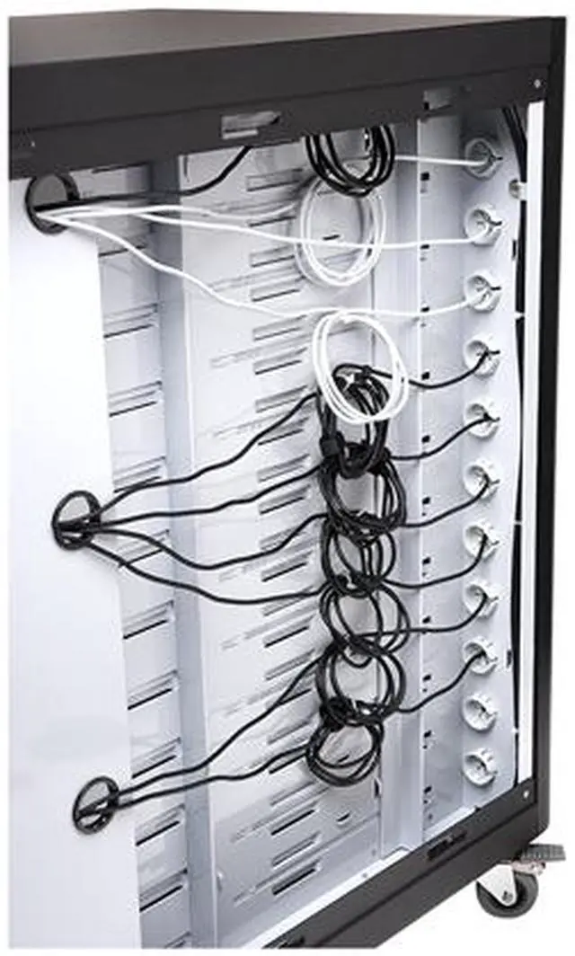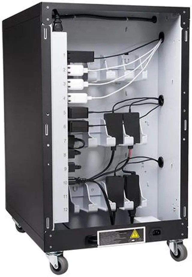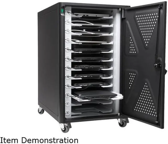 With more tablets Chromebooks™ and 2-in-1 hybrids being deployed in classrooms healthcare offices and retail or hospitality businesses the need for a solution that can store charge and secure those devices overnight is greater than ever. The AC12 Security Charging Cabinet features slide-out drawers that provide an easier check-in/check-out experience for teachers or administrators. The cabinet holds 12 devices measuring up to 14" and with the cabinet running on AC power it can safely charge all 12 devices simultaneously. Carries load with easeChromebook is an excellent choice to safely handle chromebook with added mobilityThe beautiful black color infuses an adequate appearance
