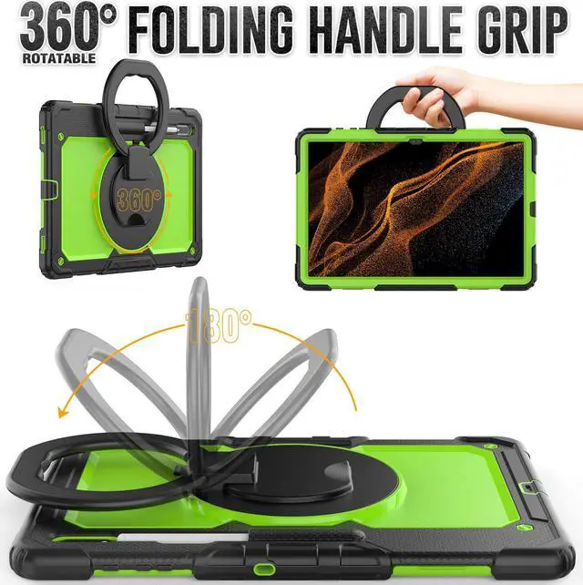 [360 Degree Rotating Kickstand & Hand Strap]: This shockproof case has a 360-degree turntable sturdy kickstand which can support your device from multiple perspectivesthe hand strap is also adjustable, securely and convenient using with one hand when in a meeting or classroom or outdoor activities.