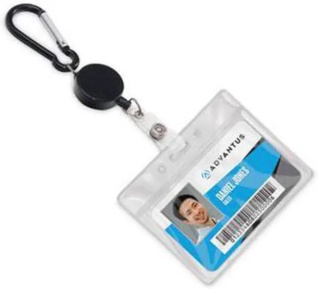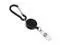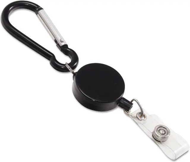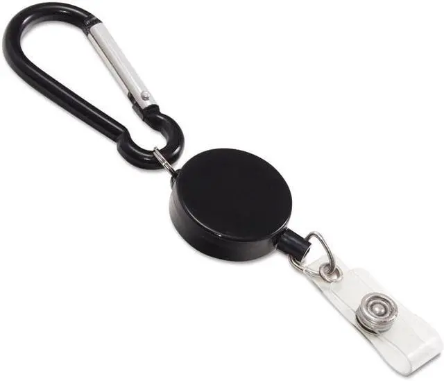 Traditional carabiner style badge reel with retractable cord. Carabiner clips securely to belt loops, briefcases and purse straps. Retractable cord provides easy scanning/swiping. Plastic badge holder strap attaches to badges, key rings and badge holders. Cord Material(s): Nylon; Cord Length: 24"; Reel Frame Material(s): Metal; Color(s): Black.