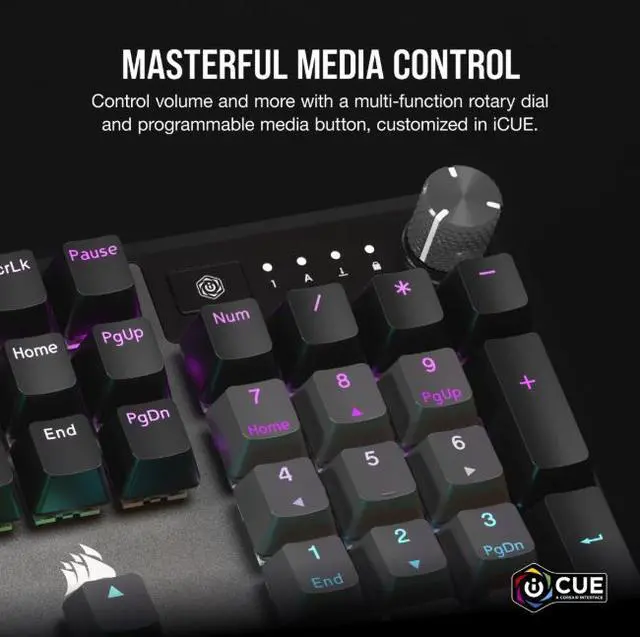 • Masterful Media Control: Control volume and more with a multi-function rotary dial and programmable media button, customizable with iCUE