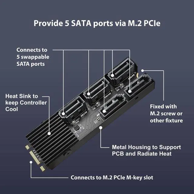 - Provide 5 SATA ports via M.2 PCIe