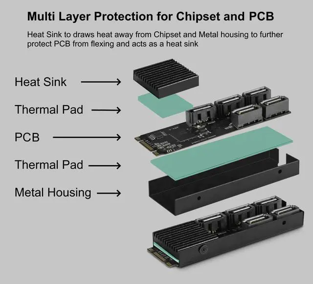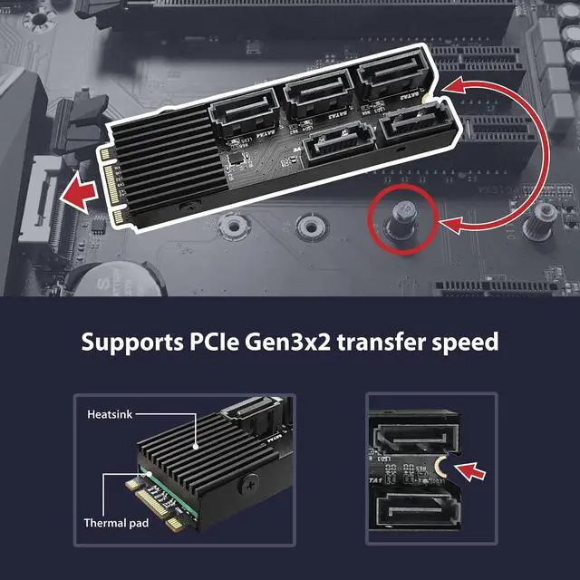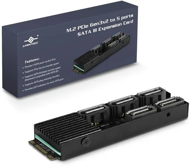 Whats Included: 1 x M.2 PCIe Gen3x2 B+M Key to 5 ports SATA III Expansion Card, 1 x Quick Install Guide