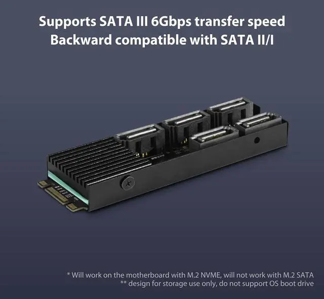 This M.2 PCIe Gen3x2 B+M Key to 5 ports SATA III Expansion Card is designed to use the M.2 NVMe slot on the motherboard to connect 5 SATA devices.