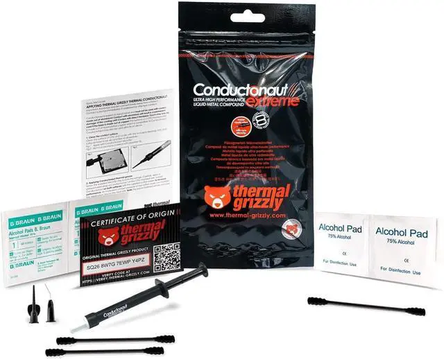 Thermal Grizzly Conductonaut is a liquid metal thermal compound based on a eutectic alloy. Thanks to a special mixing ratio of tin, gallium and indium, among others, a very high thermal conductivity is achieved. We recommend applying Conductonaut to nickel-plated copper as this offers the best long-term stability.