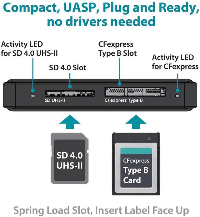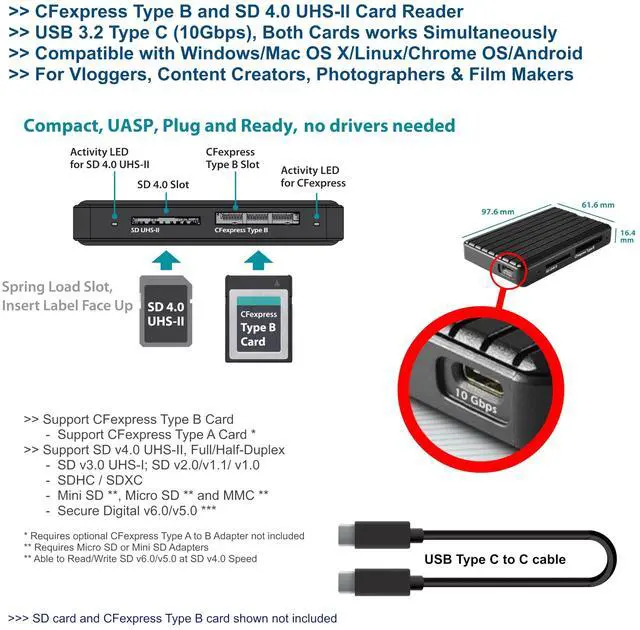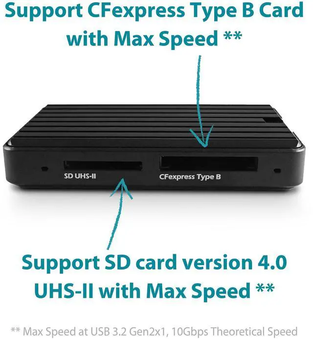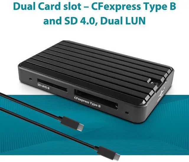 The Vantec Link USB 3.2 Gen2x1 CFexpress Type B and SD 4.0 UHS-II Card Reader is designed with both CFexpress and SD 4.0 technology together enabling the exchange of data between the two cards. It comes with a USB 3.2 Gen2x1 Type-C connection for quick transfer between the card reader and your system or laptop. This card reader easily can back up, transfer, and copy files from your CFexpress Type B card, SD 4.0, SDHC, SDXC, and SDUC memory cards to your computer. This Dual slot reader Integrated with the USB 3.1 Gen2x1 technology is Plug & Play; no drivers are required which makes it easy to use with ease.