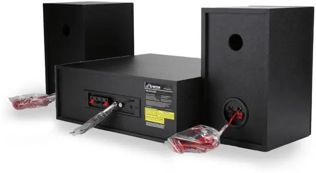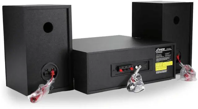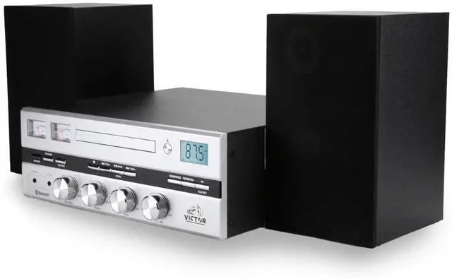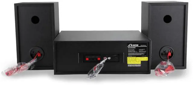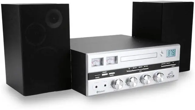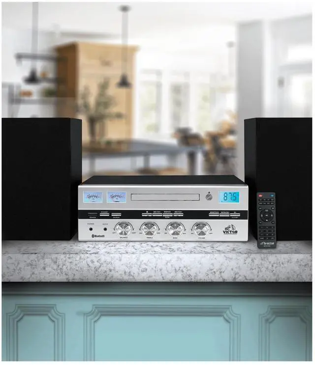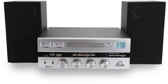 The Victor Milwaukee II Desktop Bluetooth CD Stereo System delivers robust audio performance with vintage-inspired design, featuring a front-loading CD player, Bluetooth 5.3 streaming up to 33 feet, and a digital FM radio with backlit display and 20-station memory. Enjoy your favorite music through powerful 25W x 2 detachable speakers with adjustable bass and treble controls, while fully functioning VU meters provide a visual representation of the sound. Additional connectivity includes a 3.5 mm Aux input, RCA audio output, and a headphone jack for private listening. Compatible with CD, CD-R, and CD-RW formats, the system comes with a full-function remote (batteries not included), power cord, user manual, and warranty card for a complete listening setup.
