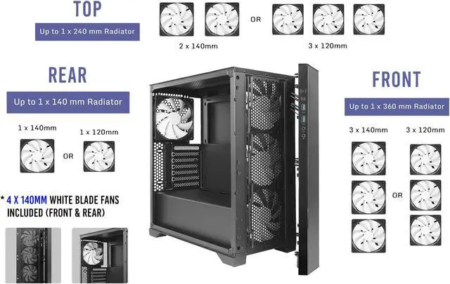 With the stripe design of rich ventilation and large area of air intake, P82 Flow also includes three 140 mm white-blade fans in the front and a 140 mm white-blade fan in the rear. It’s ready to provide high airflow for your setup.