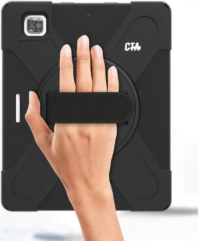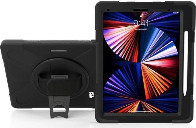 This protective tablet case keeps the iPad Pro 12.9 -inch tablet shielded from collisions, bumps, and even dust. Its durable, rugged frame with reinforced corners provides heavy-duty impact shielding without compromising on usability. A silicone jacket offers further protection for your device. The case is designed to allow full access to your iPad's ports, buttons, and jacks, and features a dust-proof, splash-proof slots that add another layer of protection. This case has both a kickstand and adjustable hand strap that allows quick transitions between tabletop and handheld use in either portrait or landscape modes.