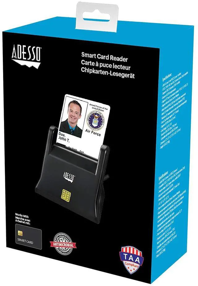 The SCR-300, TAA Compliant is an input device designed for GSA sales to government agencies, the military, their suppliers and vendors, and other organizations requiring end products manufactured to U.S. Trade Agreement Act Specifications. The Adesso SCR-300-TAA Smart Card Reader is a PC/SC, FiPS 201-compliant USB Smart Card Reader manufactured to meet U.S. Trade Agreements Act requirements. ISO7816 certified and CAC-compatible, the Smart Card Reader supports Card Terminal (CT/API) and Home Banking (HBCI) applications. The Smart Card Reader is Common Access Card (CAC) compatible, for use by government, military, Department of Defense (DoD) and other organizations utilizing CAC security/access applications. (Windows® XP, Vista, 7, 8 and 10, Mac® OS X® 10.6 and later compatible).
