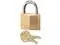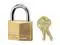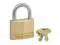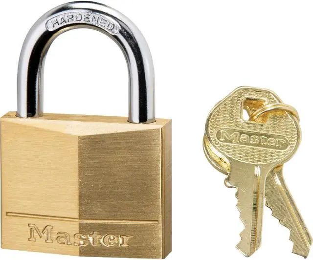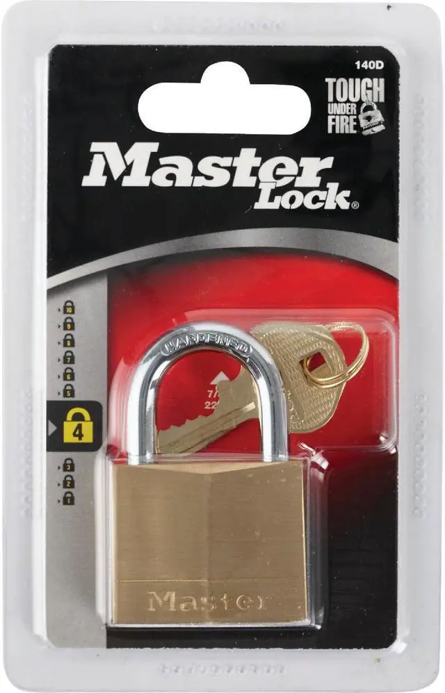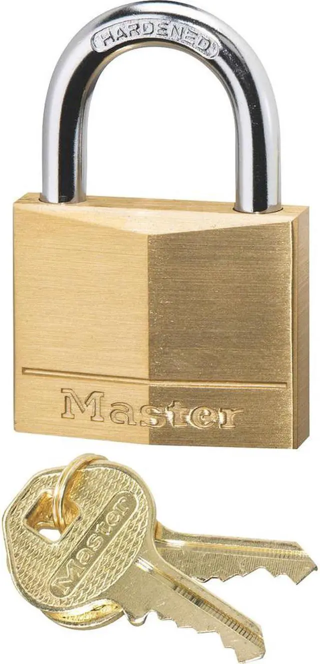 Solid brass. Corrosion-resistant case with satin brass finish. Brass cylinder, pin tumbler locking mechanism. Case-hardened steel shackle. 2 nickel-plated brass keys included. Carded.