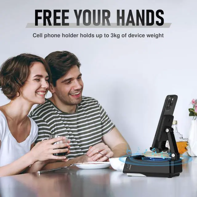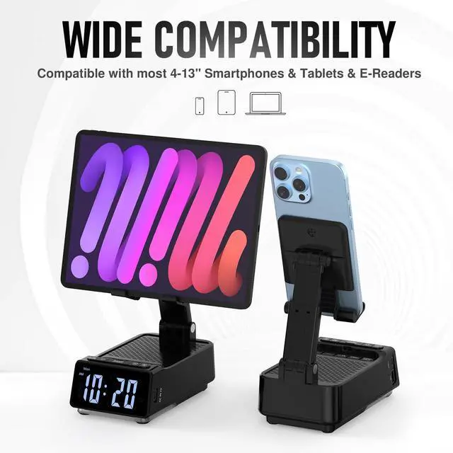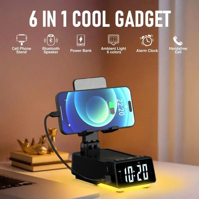6-in-1 Bluetooth Speaker & Phone Stand: The perfect gift for mom and dad. This all-in-one device features a Bluetooth speaker, adjustable phone holder, power bank, 6-color mood light, digital alarm clock, and hands-free calling. Enjoy clearer sound, convenient charging, ambient lighting, and easy video callsideal for birthdays, holidays, and everyday use