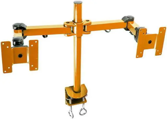 General Features -Fully articulate arms allow each of your monitors a full range of motion—forward and back, left to right, and a complete 360° rotation. -The mounting brackets can be raised or lowered on the pole, allowing adjustments to the display height for optimal visability! -Each mounting bracket pans 180° left to right so you’ll have no trouble angling your LCDs for the best viewing angles. -An expertly made C-Clamp closes tightly to provide the right support for your situation -Durable exterior coating protects your stand from nicks and scratches, so your display set-up will still look in one year or ten! -Set up is simple, with all tools and hardware included (excepting a standard sized Phillips-head screwdriver) along with a set of easy-to-follow instructions