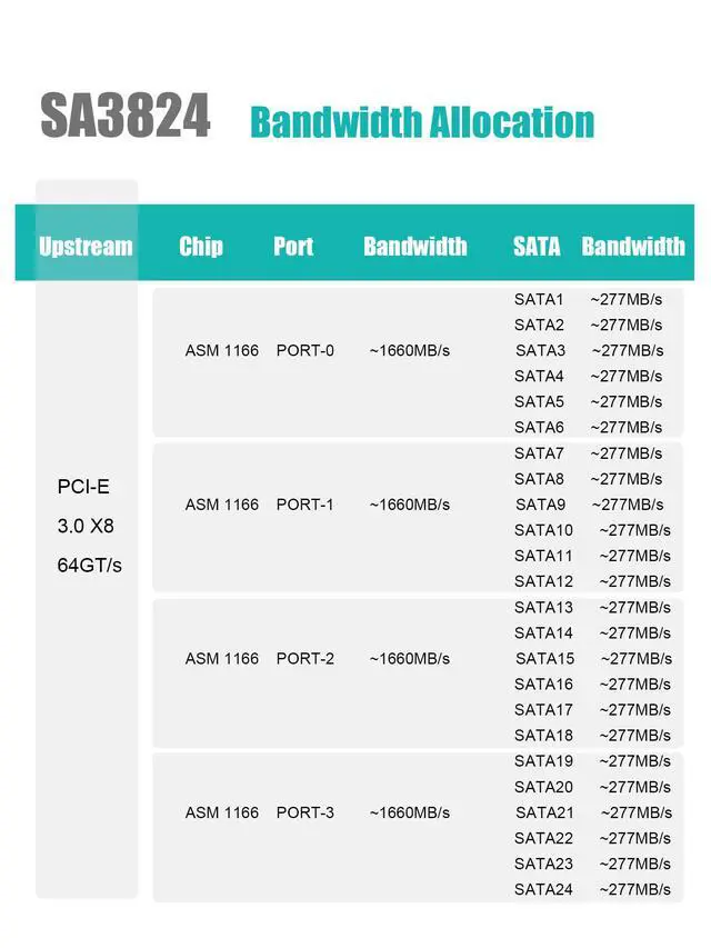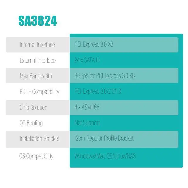 Massive Storage Expansion: The 24 - port PCIe X16 SATA III Expansion Card allows your PC to access 24 SATA drives together, perfect for creating a large storage pool or setting up software - RAID in Windows, Mac OS, and Linux (no hardware RAID support).