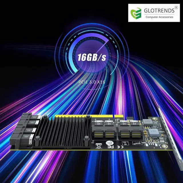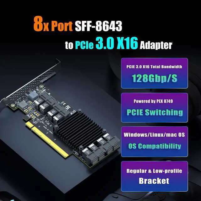 8-Port SFF-8643 to PCIe 3.0 x16 Adapter Card: Convert a single PCIe 3.0 x16 slot into 8x SFF-8643 ports, ideal for high-density U.2/U.3/M.2 NVMe RAID storage solutions.