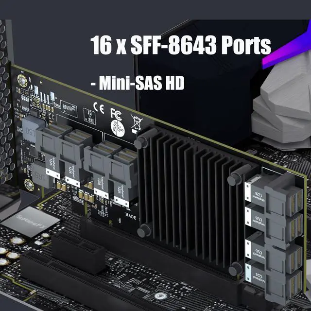 Bandwidth allocation: PCIe 3.0 x16 upstream (host interface) with up to PCIe 3.0 x4 per SFF-8643 port for consistent performance. Drive support: Handles unlimited capacity, including 2TB/4TB NVMe SSDs and 10TB/22TB SAS/SATA drives.