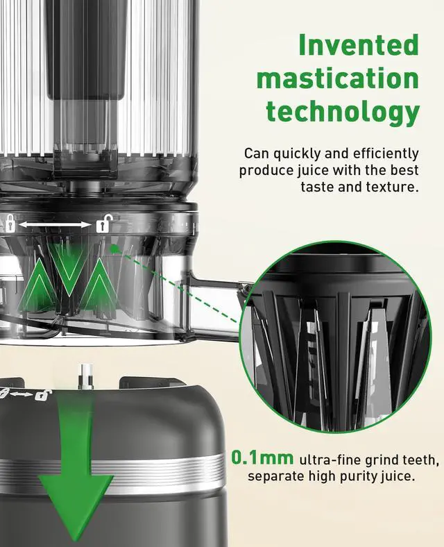 OVER 99% JUICE YIELD- Equipped with a multi-stage segmented stainless steel auger, it ensures your juicer operates at a slow speed of 40-60 RPM, squeezing more pulp without waste and extracting more juice, achieving a juice yield of over 99%.