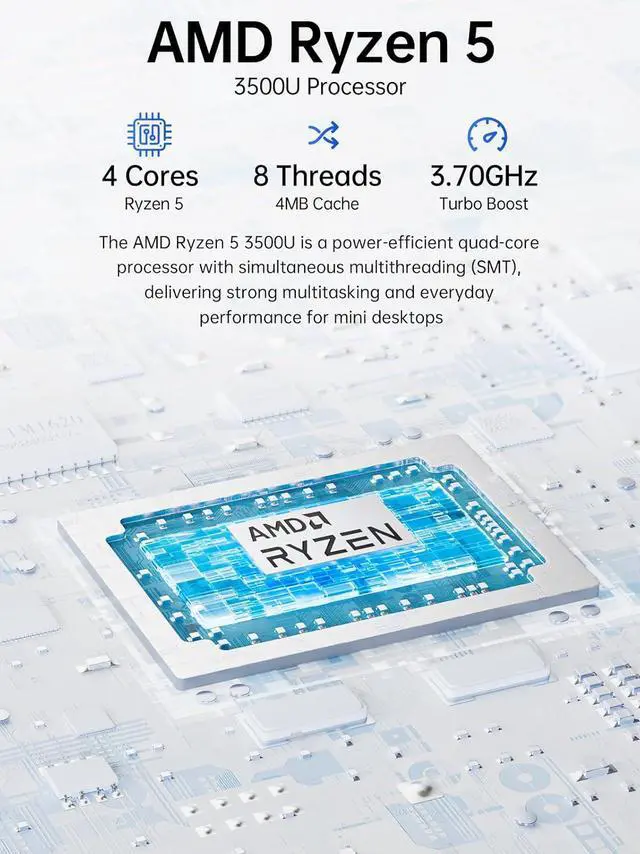 MINI PC COMPUTER OFFICE LIGHT GAMING - GMKtec Nucbox G10 Series is equipped with the Ryzen 5 3500U, a 64-bit quad-core mid-range performance x86 mobile microprocessor. This processor is based on AMD's Zen+ microarchitecture and is fabricated on a 12 nm process. The 3500U operates at a base frequency of 2.1 GHz with a TDP of 15 W and a Boost frequency of 3.7 GHz. This APU supports up to 32 GB of dual-channel DDR4-2400 memory and incorporates Radeon Vega 8 Graphics operating at up to 1.2 GHz. 20% Multi-core Performance increase over previous Ryzen 3 models such as 4300U. 35% performance increase over the Intel N-series N95/N97/N150.