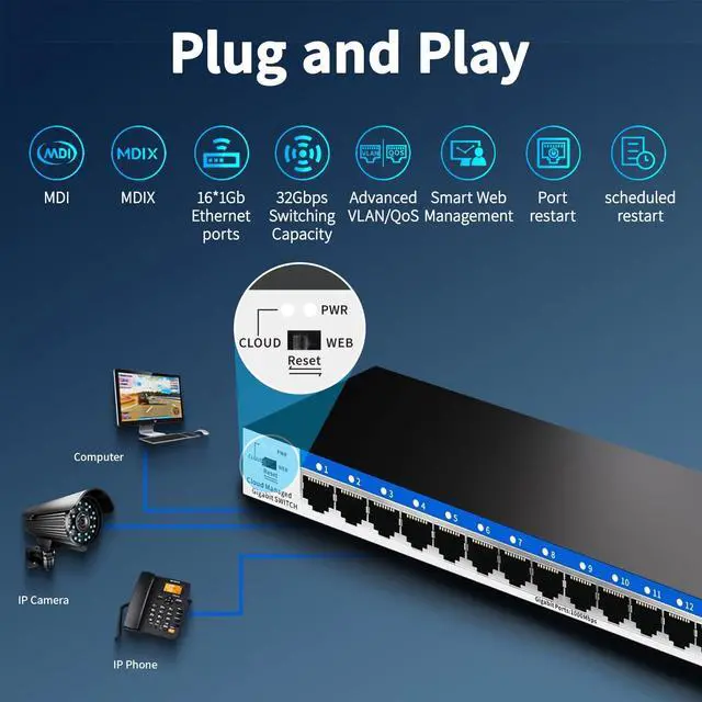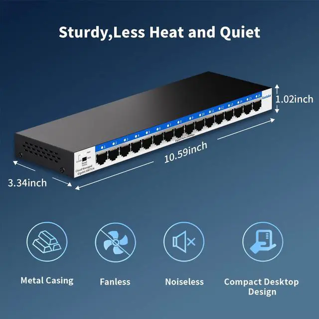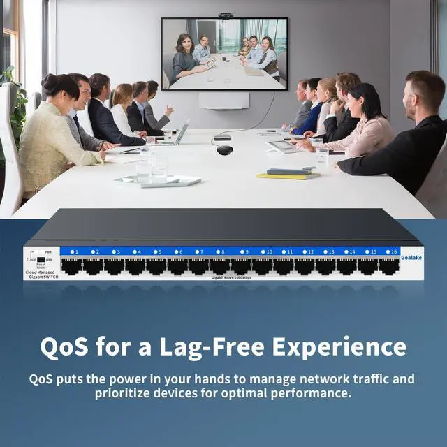 Goalake 16 ports managed switch through its web-based user interface or mobile App and free management utility, offers a variety of useful features, including network monitoring, traffic prioritization, and enhanced QoS.