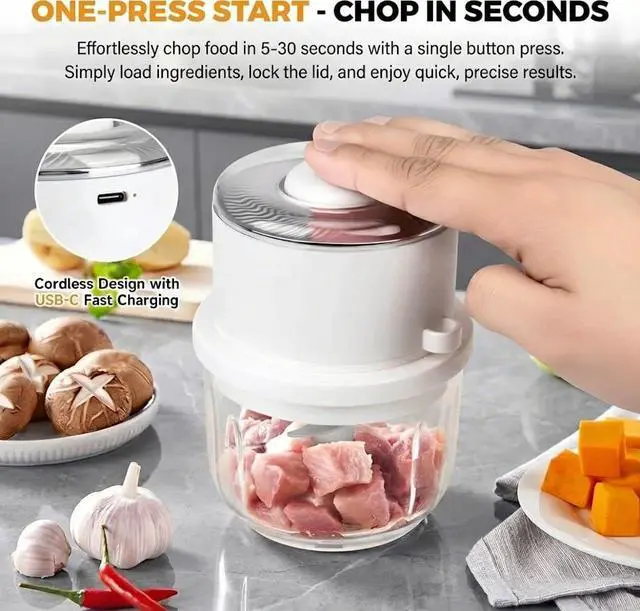 Cordless & USB-C Rechargeable: This cordless mini food processor fully charges in under 2 hours and delivers 60+ uses per charge. The wireless design allows flexible use anywhere kitchen, backyard, or camping. A convenient electric garlic chopper, mini portable veggie chopper built for modern cooking.