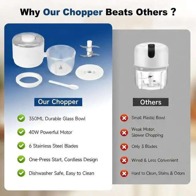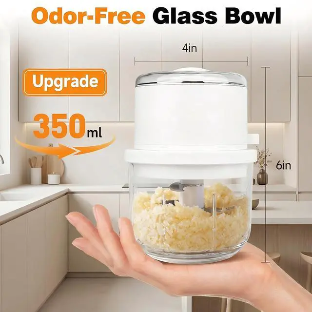 350ML Durable Glass Bowl: The thick, odor-resistant garlic chopper glass container wont absorb flavors and is perfectly sized for single meals. Compact and lightweight, this garlic chopper mini is ideal for apartments, dorms, RVs, and small kitchens. A practical mini electric chopper food chopper for everyday prep.