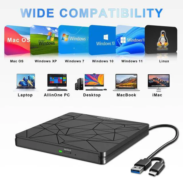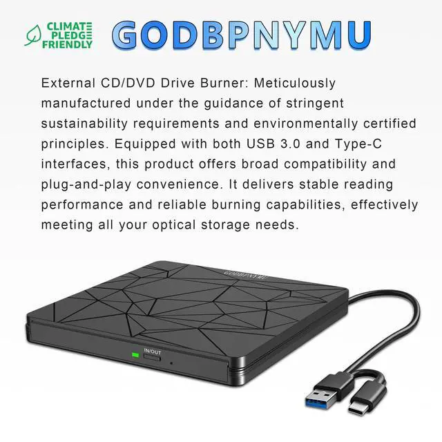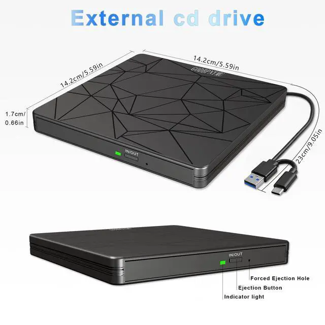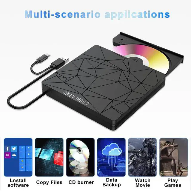 external cd/ dvd drive for laptop User Guide I. Core Functions Playback Function: Relive cherished moments preserved on VCD/CD/DVD—wedding day warmth, birthday party joy, Christmas Eve gatherings, and other special celebrations. Supports diverse content including home videos, classic films, music albums, educational materials, game discs, and important documents. Burning Function: Burn digital content like music, photos, and videos onto discs for long-term preservation, playback across multiple devices, and digital organization/archiving. II. Software Preparation Player Software (Required): Since most operating systems do not pre-install DVD playback components, a third-party player must be installed beforehand. Recommended Options: VLC Media Player: Free and open-source with comprehensive format support and optimal compatibility KMPlayer: Feature-rich with excellent decoding capabilities Burning Software (Optional): Prepare dedicated software if disc burning is required. Recommended Options: BurnAware Free Edition: Lightweight design for basic burning needs Nero: Professional-grade tool offering advanced burning and editing features III. Critical Considerations Genuine/Protected DVDs: First-time playback requires setting the “Region Code.” Select the option that exactly matches the disc's labeled region. Important Note: Region code changes are limited (typically =5 times). Choose carefully. Standard Discs:Includes self-burned VCD/CD/DVD data discs, music CDs, game discs, etc. Typically plug-and-play after installing playback software. IV. Operation Flow 1. Install required playback/burning software 2. Connect external optical drive via USB port 4. Use corresponding software to play or burn