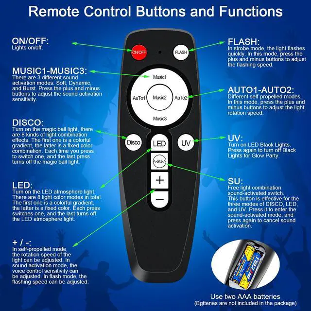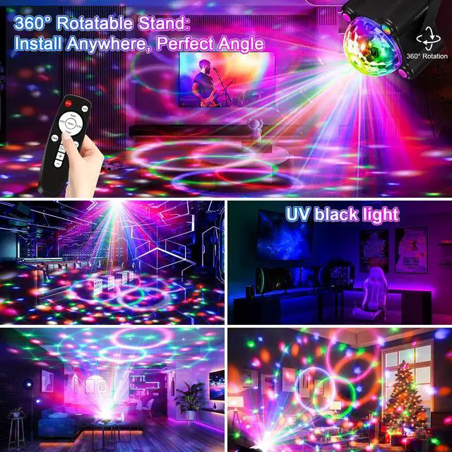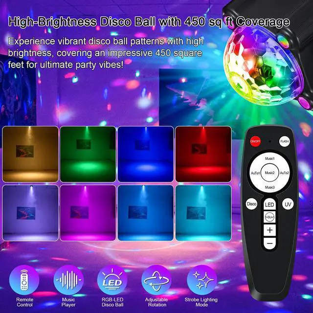 - GODENBA DJ party ball light also combines with 3 kinds of lighting methods, includes 8 different color disco ball lights, colorful ambient lights, black lights for glow party.