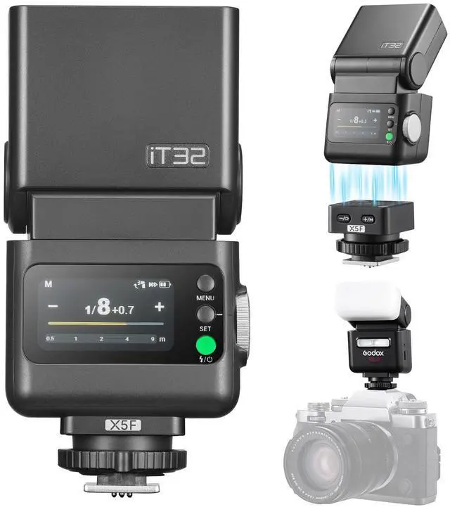When the X5 is mounted directly on the iT32 to form a single integrated unit, the system's full functionality becomes available, including TTL, manual power control, mode switching, HSS, and multi-flash group/channel configuration.