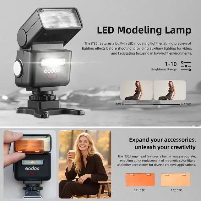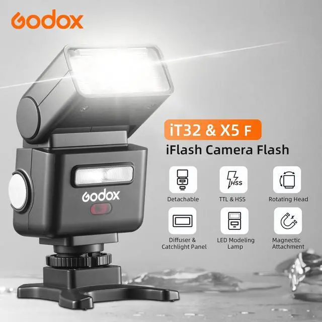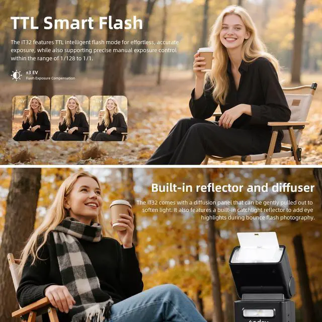 The iT32 features Intelligent TTL flash for precise auto-exposure, plus manual control (1/128-1/1), high-speed sync, and pre-/post-curtain sync.