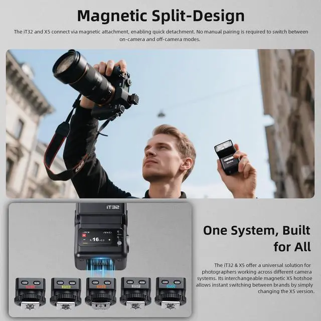 The iT32 & X5 provide a universal solution for photographers. Their interchangeable magnetic hotshoe enables instant switching across camera brands.