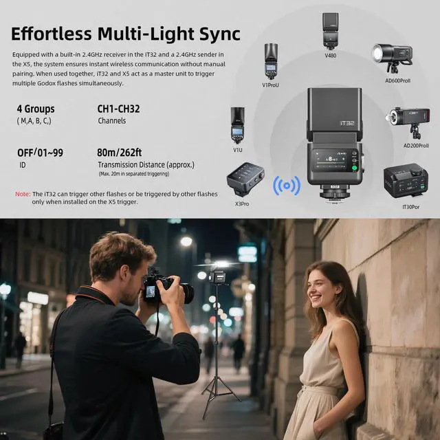 The iT32 and X5 system offers instant, auto-pairing 2.4GHz wireless communication and can act as a master unit to trigger multiple Godox flashes.