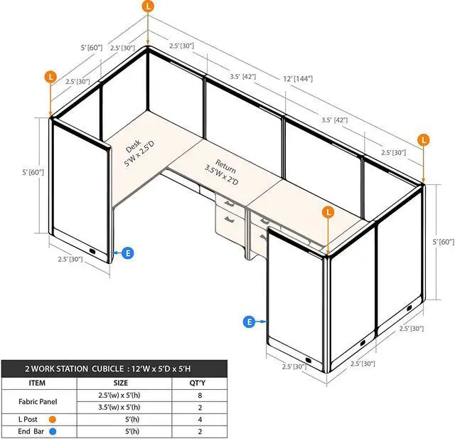 Overall Dimensions: 5'D x 12'W x 5'H (=60"D x 144"W x 60"H)