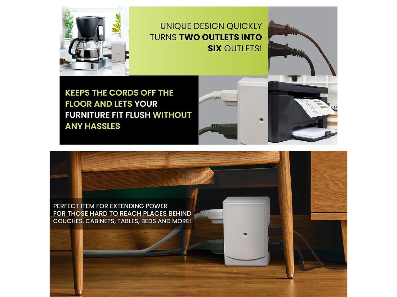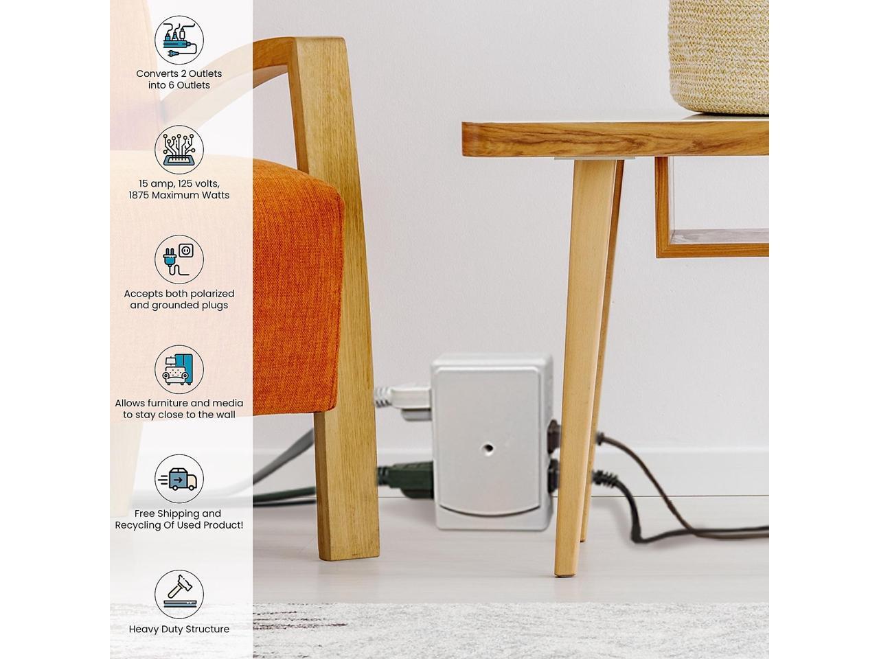 Converts 2 grounded outlets into 6. Heavy duty structure.