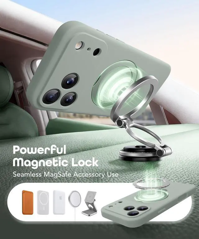for iPhone 17 Pro Case with 360° Spin Magnetic Stand, [Compatible with MagSafe][Full Camera Protection],Full Body Shockproof Liquid Silicone Case with Ring Stand for 17 Pro 6.3'', Grey Green