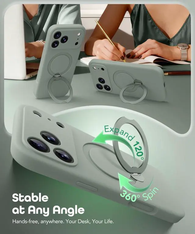 Built-in 360° Spin Durable Stand : Built-in 360° Rotating Durable Kickstand: This iPhone 17 Pro case integrates magnets, 360° rotation, and a ring-shaped kickstand. Made from aircraft-grade aluminum alloy, the kickstand easily folds, rotates freely, and locks securely. It expands at multiple angles, ensuring a sturdy and stable fit in either portrait or landscape orientation, while remaining slim and portable.
