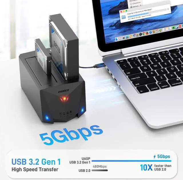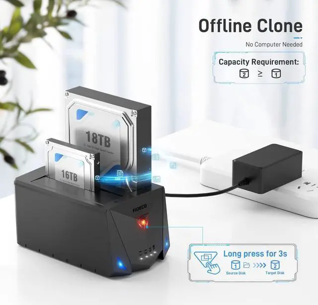 It can be also downward compatible with USB 2.0 to meet your more needs. HardDrive001Offline Clone FIDECO HDD docking station can support offline clone. No computer is needed! Just insert 2 HDDs into the respective slots (Slot 1: Source Disk;