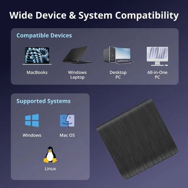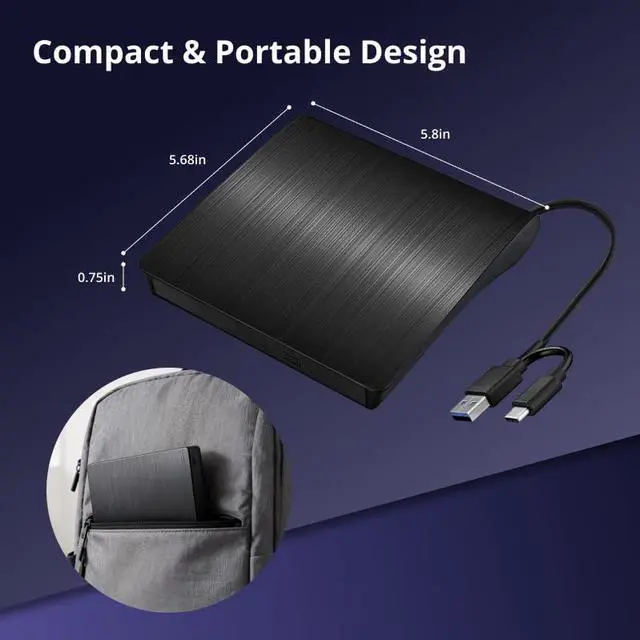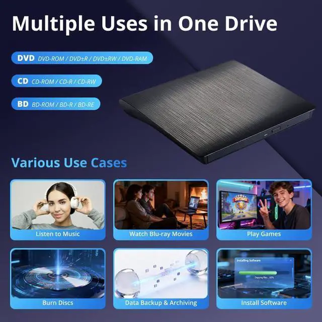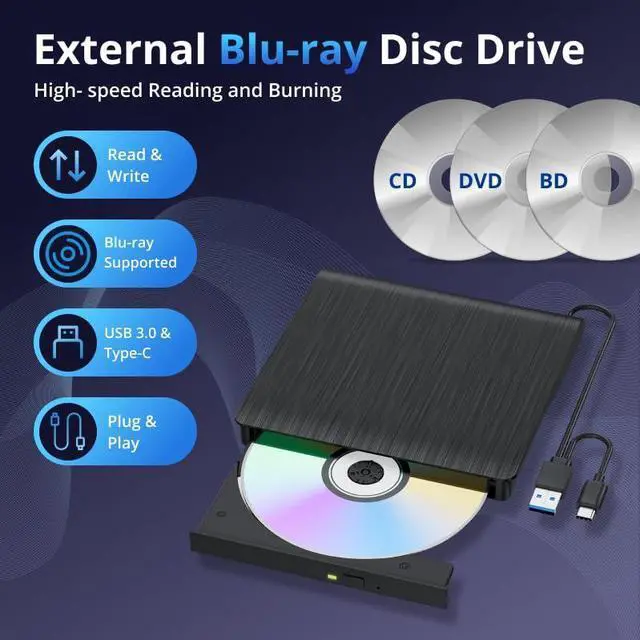 High-Def 3D Playback & Reliable 6X BD Burning This versatile BD-RW writer supports high-definition 3D Blu-ray playback and precision burning for BD, DVD, and CD formats. It delivers stable maximum speeds of 6X for BD, 8X for DVD, and 24X for CD, providing a secure solution for high-capacity data backup and long-term media archiving. High-Speed USB 3.0 & Type-C Dual Interface Equipped with a 2-in-1 integrated cable featuring both USB 3.0 and Type-C connectors, this drive ensures rapid 5Gbps data syncing and consistent high-speed performance. It offers seamless connectivity for modern ultra-thin laptops and traditional desktops without needing extra adapters. Seamless Cable Management & Ultra-Slim Design The data cable is ingeniously hidden within the bottom storage slot, preventing cable loss and enhancing portability. Its lightweight, slim profile features anti-slip shockproof pads, ensuring quiet operation and protection during home, office, or travel use. Wide Compatibility & Multi-Format Support Fully compatible with Windows 11/10/8.1/7, Mac OS, and Linux. It supports a wide range of formats including BD-ROM, BD-R/RE, DVD±R/RW, DVD-RAM, and CD-R/RW. (Note: Not compatible with Chromebooks, TVs, Tablets, iPads, or Car systems). Usage Optimization & Region Code Tips For peak performance on low-power devices, please connect the included external power cable. Blu-ray playback requires third-party software (such as VLC, Leawo, or PowerDVD). For 3D Blu-ray playback, a 3D-capable display and compatible software are required.