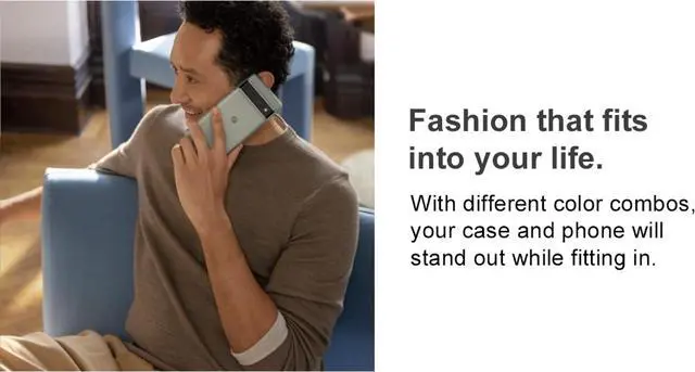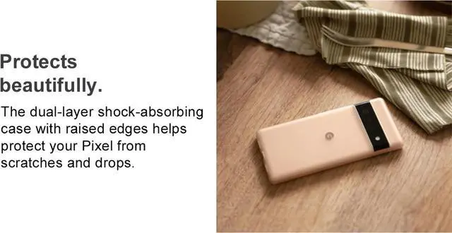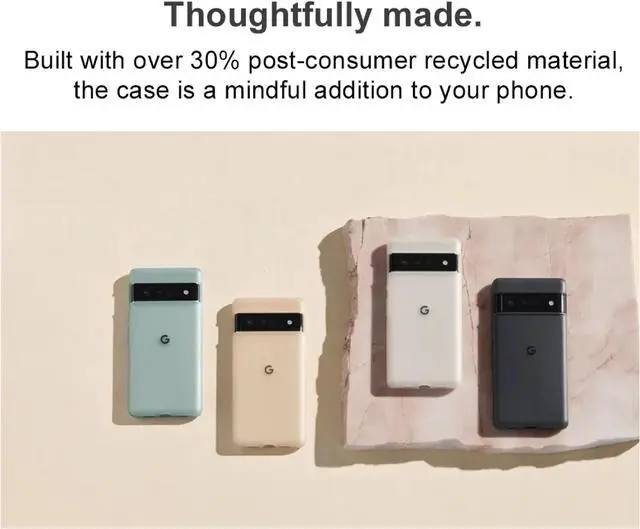 Different colors to choose from, Built with over 30% post-consumer recycled material, The dual-layer, shock-absorbing case with raised edges, helps protect your Pixel from scratches and drops