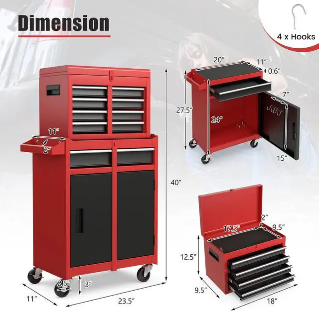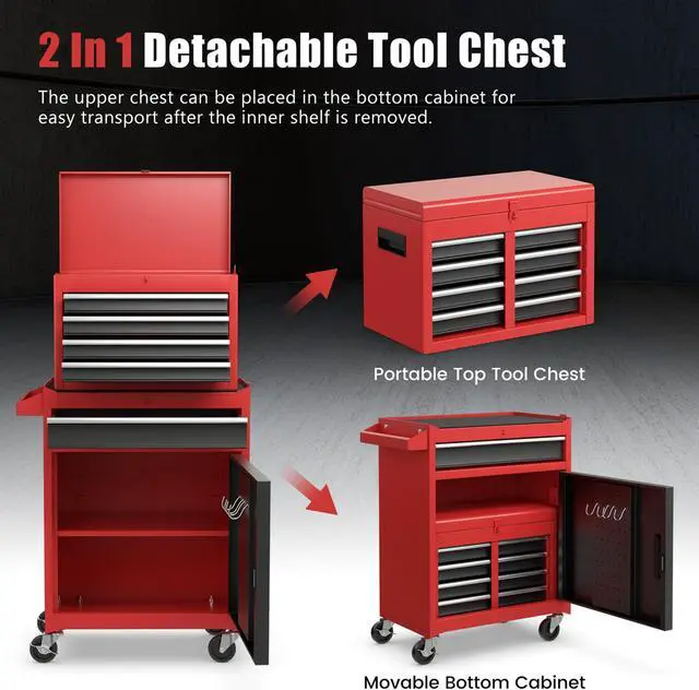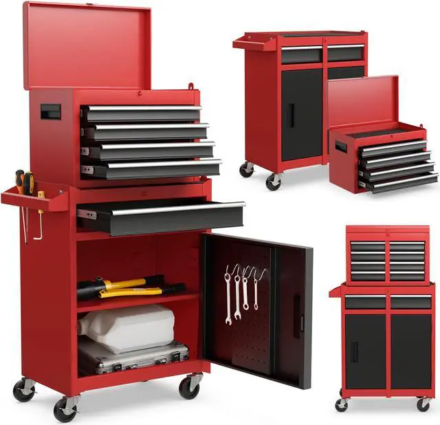 Use our tool storage cabinet to arrange tools and supplies for off-site work. The cart is equipped with two-storey tools and has five drawers with a maximum load of 220.5lbs. Super storage space to meet your needs. Combination cabinet with flexible lockable wheels and comfortable handles allow you to easily carry tools out to different working places. In addition, it has anti-seismic EVA material and lock rod design, which means that your tools and equipment will be well protected in travel and harsh construction environment. What are you waiting for? Don't hesitate to buy one!