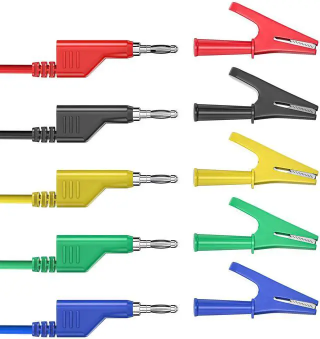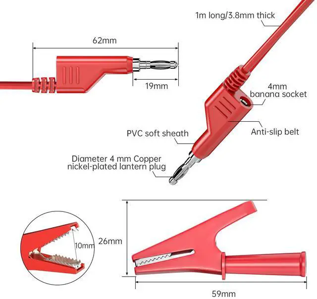 - The tail of alligator clips is 4mm female socket. It is easy for you to connect the banana test leads with the crocodile clips.