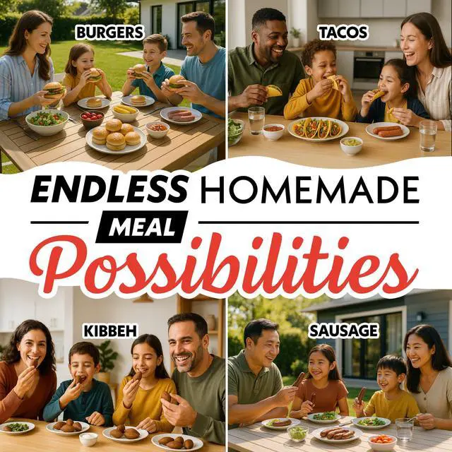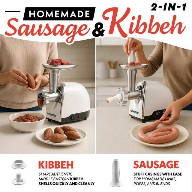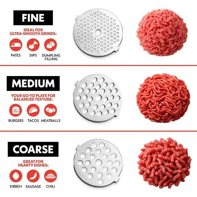Create delicious, gourmet sausages using the sausage attachment, or kibbeh using the kibbeh maker attachment. Enjoy a whole new level of personalization and control in your cooking. Choose from 3 cutting plates for fine, medium or coarse grinding, and start making the most flavorful burgers, meatballs, meat loaf, hash, sausages and more by creating your own personalized meat blends.