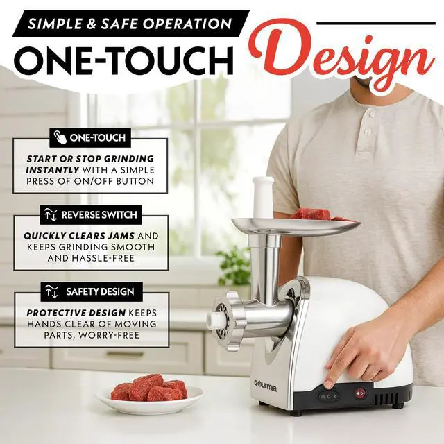 The easy-to-use, 3-way safety switch, makes this machine so simple to operate. The PrimePlus Meat Grinder Deluxe from Gourmia is the perfect addition to any kitchen.