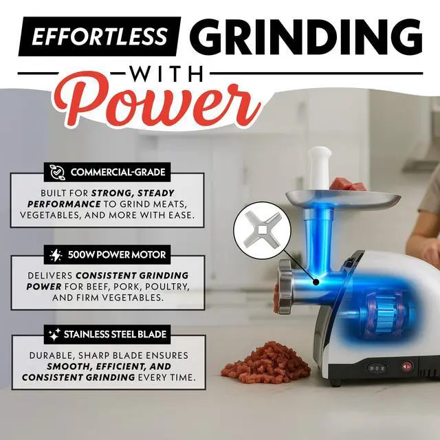 Made with long lasting exceptionally strong material, a 500W ETL approved motor, and stainless steel blades to ensure proper grinding.