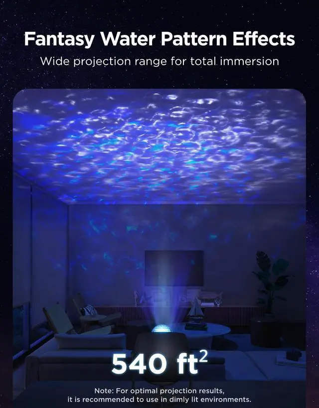 Expansive 540ft² Wave Projection: With 4 RGBW LEDs and dual-layer lens, govee star projector light creates vivid water ripples across 540ft². Combines waves and stars for immersive underwater ambiance. Note: For optimal projection results, it is recommended to use in dimly lit environments.